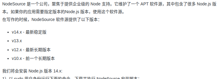 这个脚本将会添加 NodeSource 的签名 key 到你的系统,创建一个 apt 源文件,安装必备的软件包,并且刷新 apt 缓存。
