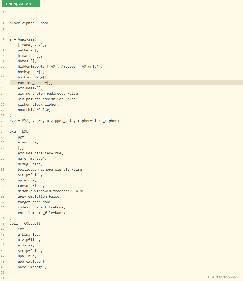 在目录下面会生成一个 manage.spec的文件,我们可以打开看一下内容: